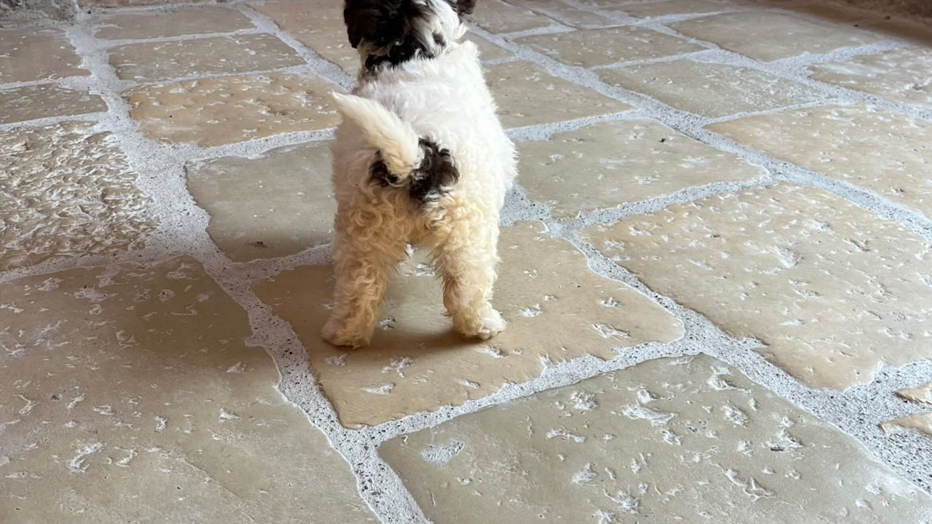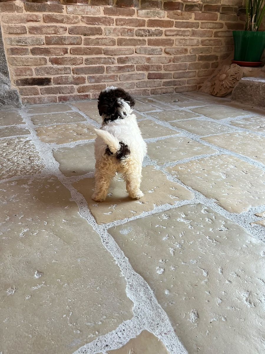 Dal punto di vista estetico, è una cucciola davvero unica: il suo soffice mantello riccio color avorio è impreziosito da una simpatica macchia marrone che circonda la codina, un dettaglio che la rende inconfondibile. Il suo musino dolce e furbetto conquista al primo sguardo, con quegli occhioni vivaci che sembrano sorridere sempre.