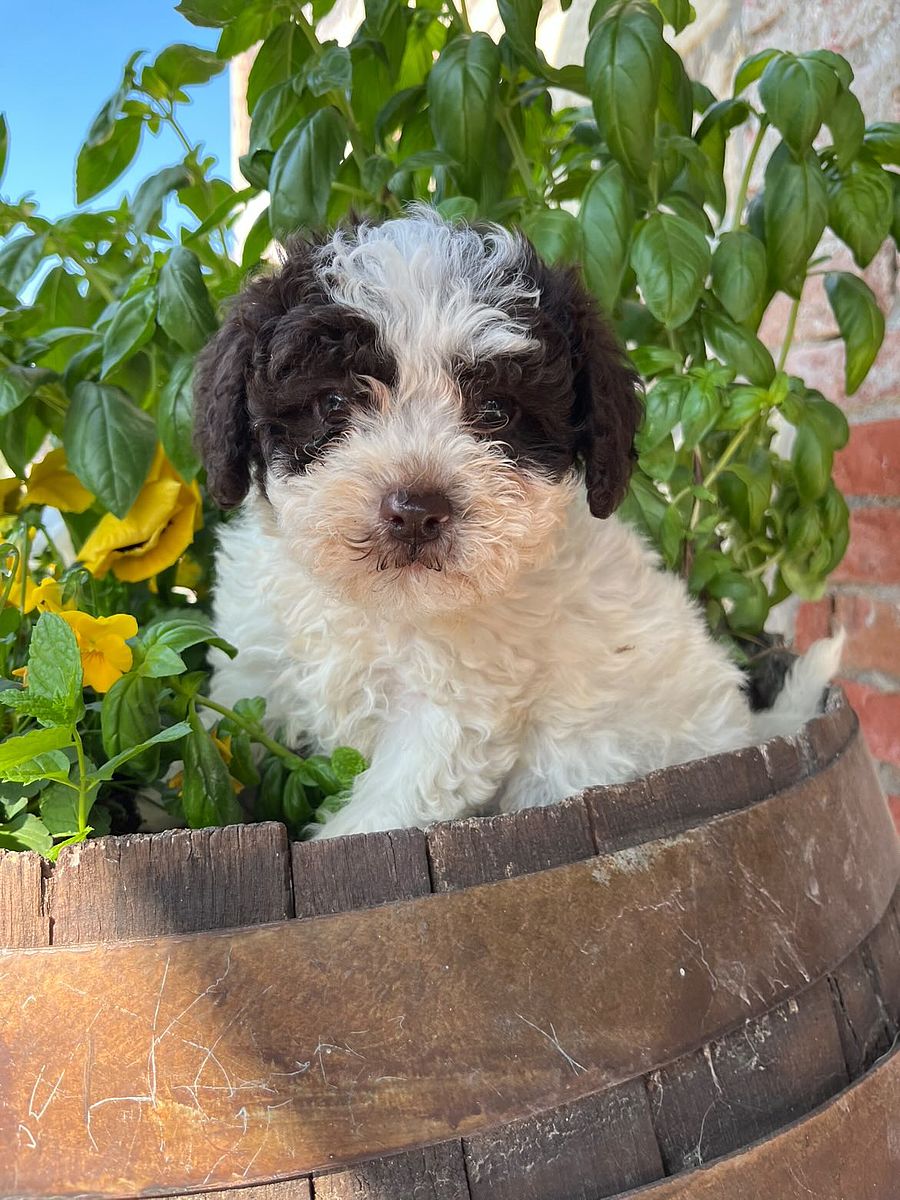 Questa splendida cucciola di Lagotto Romagnolo è un vero concentrato di allegria e curiosità! Fin dai primi giorni ha mostrato un carattere vivace e intraprendente: adora esplorare ogni angolo, scoprire nuovi suoni e soprattutto… giocare! È sempre pronta a coinvolgere chiunque in un momento di puro divertimento, con la sua energia contagiosa e il suo sguardo pieno di entusiasmo.